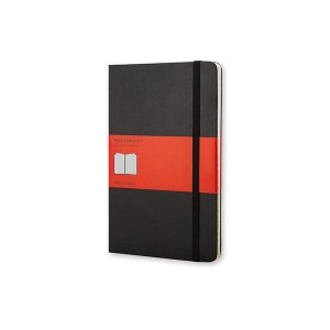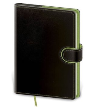Zápisník s měkkou, ve hřbetu šitou vazbou v kartonových deskách, obepnutý pružnou páskou proti samovolnému otevírání.