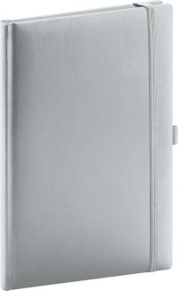 Zápisník v kovové barvě s metalickým efektem s pevnou, ve hřbetu šitou vazbou v kartonových deskách, obepnutý pružnou páskou proti samovolnému otevírání.
