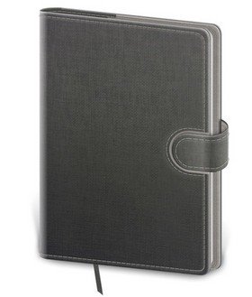 Zápisník s měkkou, ve hřbetu šitou vazbou v kartonových deskách, obepnutý pružnou páskou proti samovolnému otevírání.