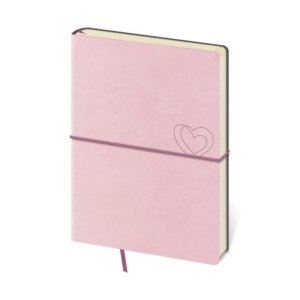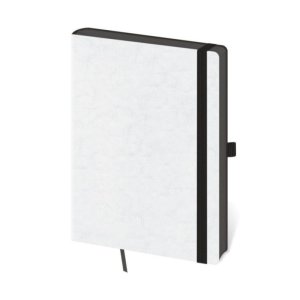 Více stran pro delší příběhy. ,Zápisník s pevnou, ve hřbetu šitou vazbou v kartonových deskách, obepnutý pružnou páskou proti samovolnému otevírání.