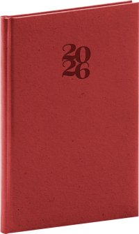 Týdenní diář Tomy 2026 v hnědo-červené barvě.