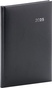 Plánovací týdenní diář Balacron 2025 formátu B5 v černém provedení, doplněný o stříbrný letopočet.