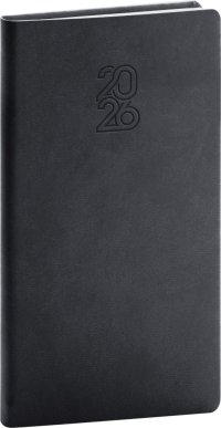 Měsíční diář pro rok 2026 z PVC Rozměr 82 x 184 x 5 mm Celkem 32 stran Info strany obsahují: přehledný kalendář 2026/2027, plánovací kalendář 2026, státní svátky a významné dny, prostor pro poznámky, …