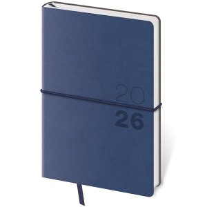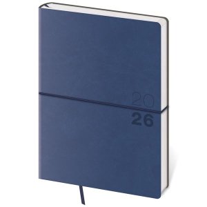 Moderní diář v měkké ohebné vazbě s kulatou příčnou gumičkou přes hřbet.