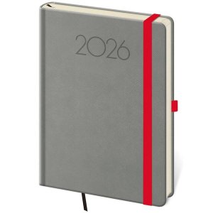 Moderní diář v měkké ohebné vazbě s kulatou příčnou gumičkou přes hřbet.