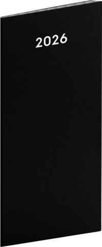 Měsíční diář pro rok 2026 z PVC Rozměr 92 x 160 x 8 mm Celkem 80 stran Info strany obsahují: přehledný kalendář 2026/2027, plánovací kalendář 2026, státní svátky a významné dny, prostor pro poznámky, …