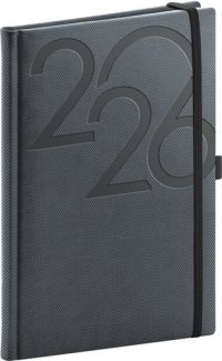 Moderní diář v měkké ohebné vazbě s kulatou příčnou gumičkou přes hřbet.