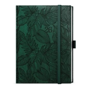 Diář v zelené vivelle s krásnou celoražbou motivu tropických listů Diář v B6 formátu s velkým prostorem pro poznámky a plánování Rozměr: 12 x 16,5 cm Počet stran: 336 Perforované rožky Vlepená kapsa