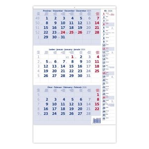 Rozměr: 31,5 x 45 cm 12 listů České třímesíční kalendárium s poznámkami, jmény a se svátky vybraných evropských států (CZ / SK / A / B / D / F / H / CH / I / PL / RUS / UKR) ZAKÁZKOVÁ VÝROBA OD 50 KS: …