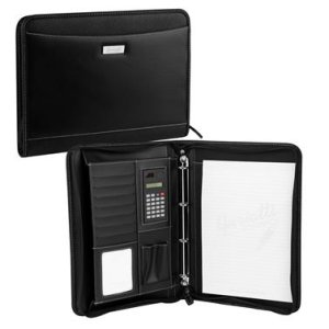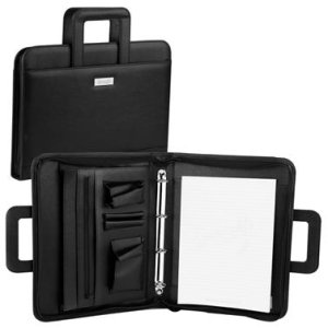 Konferenční deska A4 s vysouvatelnými uchy. -barva černá, ekokůže; Portfolio zahrnuje: čtyř-kroužkový pořadač, 2 kapsy na doklady, dvě menší kapsy, jedna na zip, 2 místa pro pera, kapsa pro mobil,...