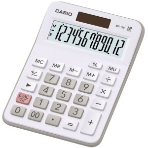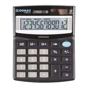 Stolní kalkulačka s mírně nakloněným displejem a plastovými tlačítky, 12ti místný dispej Korekční tlačítko, dvojitá nula, procenta, 3 paměťové klávesy Duální napájení: solární/bateriové