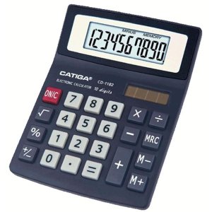Kompaktní stolní kalkulátor se základními funkcemi a mírně nakloněným displejem.