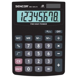 Stolní kalkulačka s plastovými klávesami, oddělování tisíců, osmimístný dispej Klávesa %, klávesa +/-. 4 paměťové klávesy Duální napájení: solární/bateriové