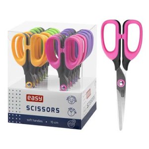 Nůžky 15 cm s měkkou, ohebnou rukojetí, balené po 12 ks na stojánku.