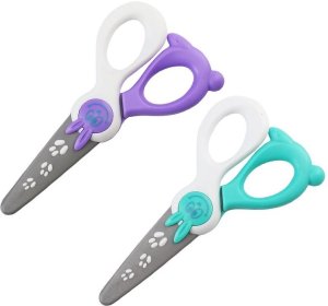 Dětské kulaté nůžky s pomocí pro rozevření, kterou jednoduše odklopíte či zaklopíte v případě potřeby.