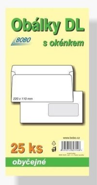 Obálky 220x110 mm, balení 25 ks. Balení klasických poštovních obálek ve formátu DL.