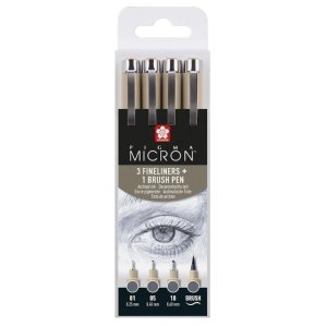 Výběr 4 chladně šedých per Pigma Micron a štětcových per: Pigma Micron 01 (0,25 mm), Pigma Micron 05 (0,45 mm), Pigma Micron 10 (0,60 mm) a Pigma Brush.