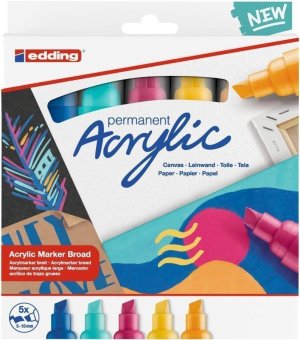 Sada 5 akrylových popisovačů edding 5000 B ve výrazných barvách pro spontánní kreativitu na světlých i tmavých površích materiálů jako je plátno, malířský papír, hladké dřevo a kámen.