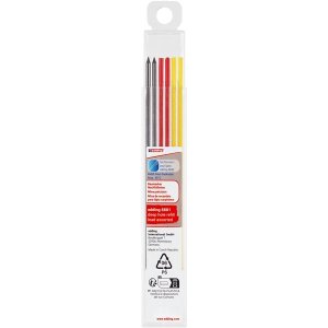 Sada náhradních tuh pro tenkou tesařskou tužku edding 8880 (211.548) obsahuje grafitové tuhy tvrdosti H, červené a žluté voskové tuhy Pro přesné značení na hrubých i hladkých površích jako je dřevo, …