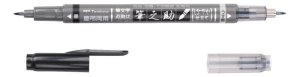 Oboustranný fix Fudenosuke (brush pen) se dvěma elastickými štětcovými hroty (typu soft): černým pro kreslení obrysů a šedým pro stínování.Linka se mění od tenké po hrubou v závislosti na tlaku vyvíjeném …