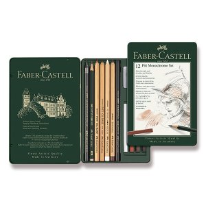 Umělecká sada Faber-Castell Pitt Monochrome v plechové krabičce obsahuje celkem 12 kusů - uhel, 2 grafitové tužky, 4 pastely, 4 křídy a profesionální gumu.