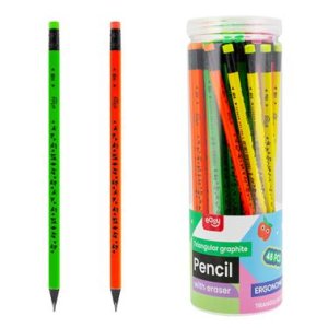 Trojhranné tužky ve fluoreskujících barvách s barevnou gumou v průhledném obalu.