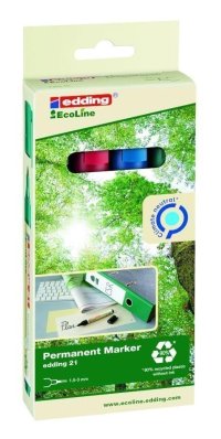 Permanentní popisovač edding 21 z ekologické řady EcoLine má tělo vyrobené nejméně z 90 % z recyklovaných materiálů.