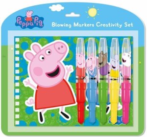 Set obsahuje 5 barevných foukacích fixů s potiskem, sešit s obrázky k vybarvení a plastovou šablonku.