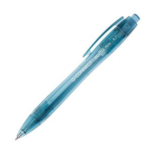 Stiskací kuličkové pero Q- Connect v modré barvě Vyrobeno ze 100% recyklovaných PET lahví Barva náplně: modrá Šíře stopy: 0,7 mm Množství v originálním balení: 10 ks