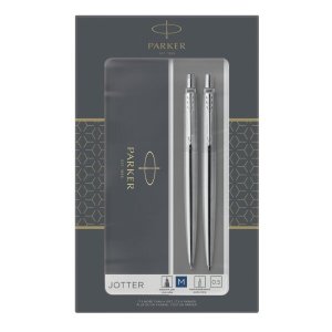 Sada Duo Set obsahuje kuličkové pero Parker Jotter Stainless Steel a mechanickou tužku Parker Stainless Steel.