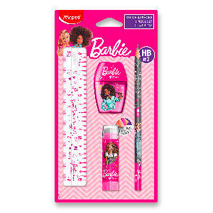 4dílná souprava školních potřeb v atraktivním designu s motivem oblíbené panenky Barbie.
