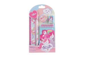 Školní set obsahuje gumu, pravítko, ořezávátko, propisku a tužku.