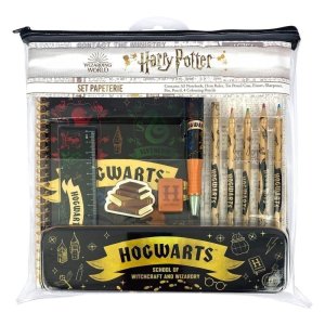Sada psacích potřeb v průhledném pouzdru s motivem Harryho Pottera, která obsahuje všechny kouzelnické nezbytnosti do školy nebo na doma.