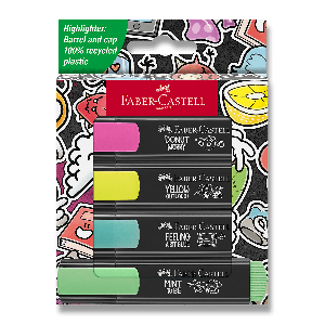 Sada plochých zvýrazňovačů Faber-Castell Textliner 46 ve 4 odstínech v moderním graffiti designu.