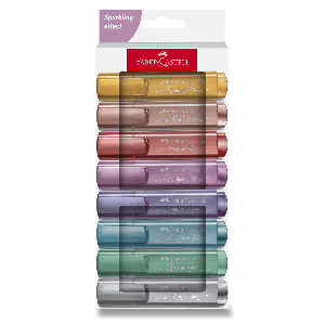 Plochý zvýrazňovač Faber-Castell Textliner 46 Metallic v 8 netradičních odstínech s metalickým efektem.