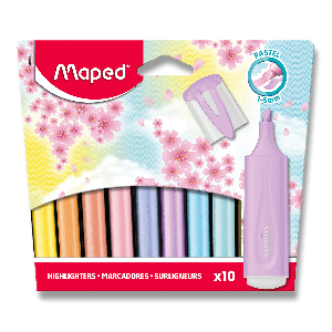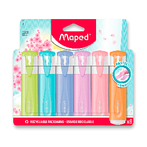 Plochý zvýrazňovač Maped Fluo Peps Pastel s víčkem v barvě inkoustu v pastelových barvách.