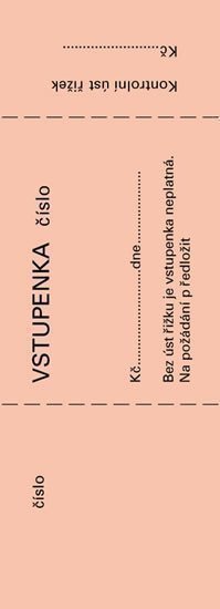 Číslovaná bločková vstupenka obsahuje 100 listů (vstupenka + kontrolní ústřižek odtržitelný perforací) Dodáváme v barevném mixu: červená, zelená, žlutá, modrá