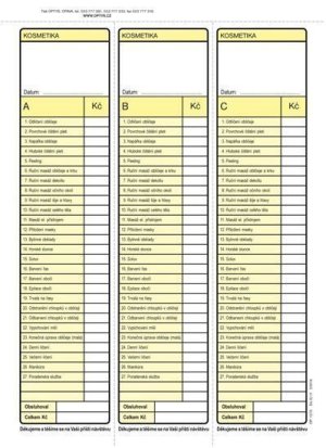 Blok pro kosmetická studia s karbonovou (propisovací) vrstvou, 100 listů, každý list má tři části, formát A5, nečíslovaný Formát:A5 Samopropisovací:Ano Číslovaný:Ne Počet listů:100
