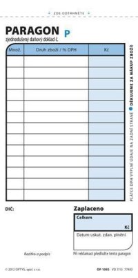 Účtenky, 50 listů, 155 x 70 mm. Blok padesáti volných nelepených a nečíslovaných listů.
