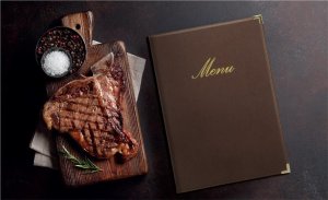 Hnědá barva a zlatý nápis Menu zdobí tento jídelní lístek ve formátu A4.