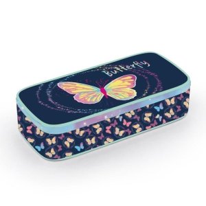 Školní pouzdro etue je opatřeno pevnými zipy, kapsičkou na zip a klopou s pevnými poutky po obou stranách.