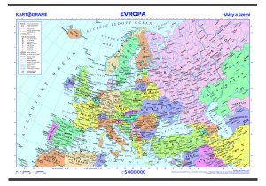 Nástěnná mapa, v novém vydání, přehledně zobrazuje politické uspořádání evropského kontinentu.