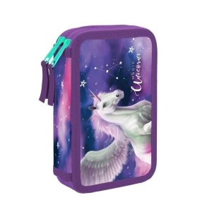 Penál s motivem jenorožce. Penál má 1 větší přihrádku na psací potřeby a 1 menší přihrádku na drobnosti.
