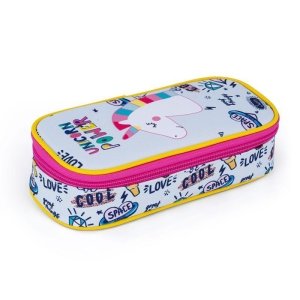 Školní pouzdro je opatřeno pevnými zipy, uzavíratelnou kapsičkou na zip, přihrádkou na pravítko a klopou s šesti poutky na psací potřeby.