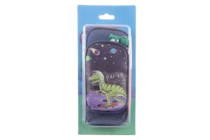 Penál s motivem dinosaura. Penál má 1 větší přihrádku na psací potřeby a 1 menší přihrádku na drobnosti.
