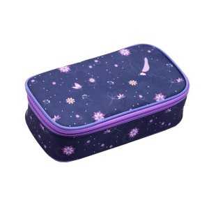 Školní pouzdro je opatřeno pevnými zipy, uzavíratelnou kapsičkou na zip, přihrádkou na pravítko a klopou s šesti poutky na psací potřeby.