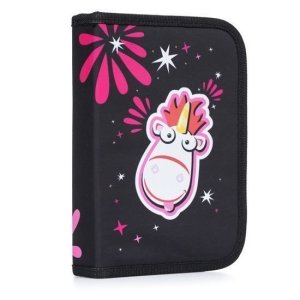 Dívčí školní penál, jednochlopňový se spoustou gumiček, motiv jednorožec