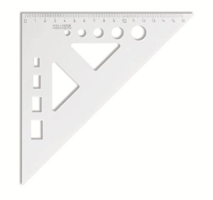 Trojúhelník s geometrickými funkcemi, 16 cm přeponou a držadlem. 4 funkce: trojúhelník se stupnicí symetrické čáry paralelní čáry úhloměr