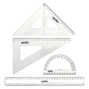 Sada obsahuje pravoúhlý trojúhelník, trojúhelník s ryskou, 30cm pravítko a úhloměr, vyrobeno z průhledného plastu