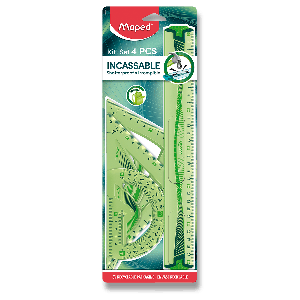 4dílná sada Maped Unbreakable Maxi ohebných a nezlomitelných rýsovacích potřeb obsahuje: pravítko 30 cm trojúhelník 60°/21 cm trojúhelník 45°/21 cm úhloměr 180°/12 cm Mix barev (zelená, modrá).